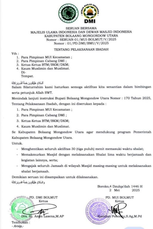 Boroko, 4 Dzulqaadah 1446 H / 2 Mei 2025 — Dewan Masjid Indonesia (DMI) dan Majelis Ulama Indonesia (MUI) secara resmi mengeluarkan surat seruan bersama yang mendukung penuh program pemerintah dalam meningkatkan pelaksanaan salat berjamaah di masjid-masjid di wilayah Kabupaten Bolaang Mongondow Utara.
